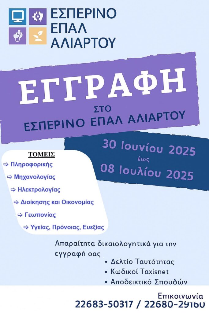 μετεγγραφούν σε οποιαδήποτε τάξη του 1ου Εσπερινού ΕΠΑ.Λ. Αλιάρτου, για τη νέα σχολική χρονιά 2025-