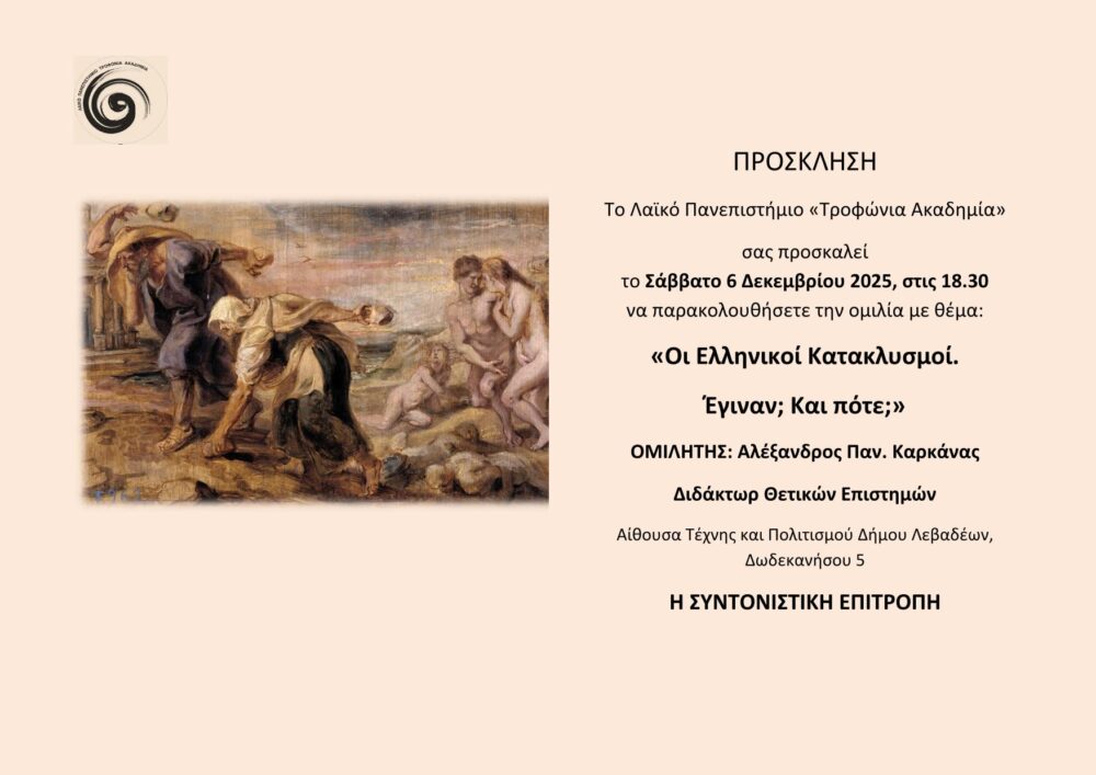 Το Λαϊκό Πανεπιστήμιο “Τροφώνια Ακαδημία” διοργανώνει εκδήλωση με θέμα “Οι Ελληνικοί Κατακλυσμοί. Έγιναν; Και πότε;” και  τον εκπαιδευτικό Δρ. Αλέξανδρο Καρκάνα, το Σάββατο 6 Δεκεμβρίου, στις 18:30, στην αίθουσα Τέχνης και Πολιτισμού του Δήμου Λεβαδέων (Δωδεκανήσου 5).