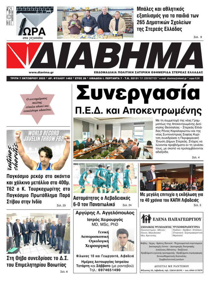 Ενημέρωση “ΔΙΑΒΗΜΑ”, Βοιωτία και Στερεά Ελλάδα. (1462 Τρίτη 7/10/2025)
