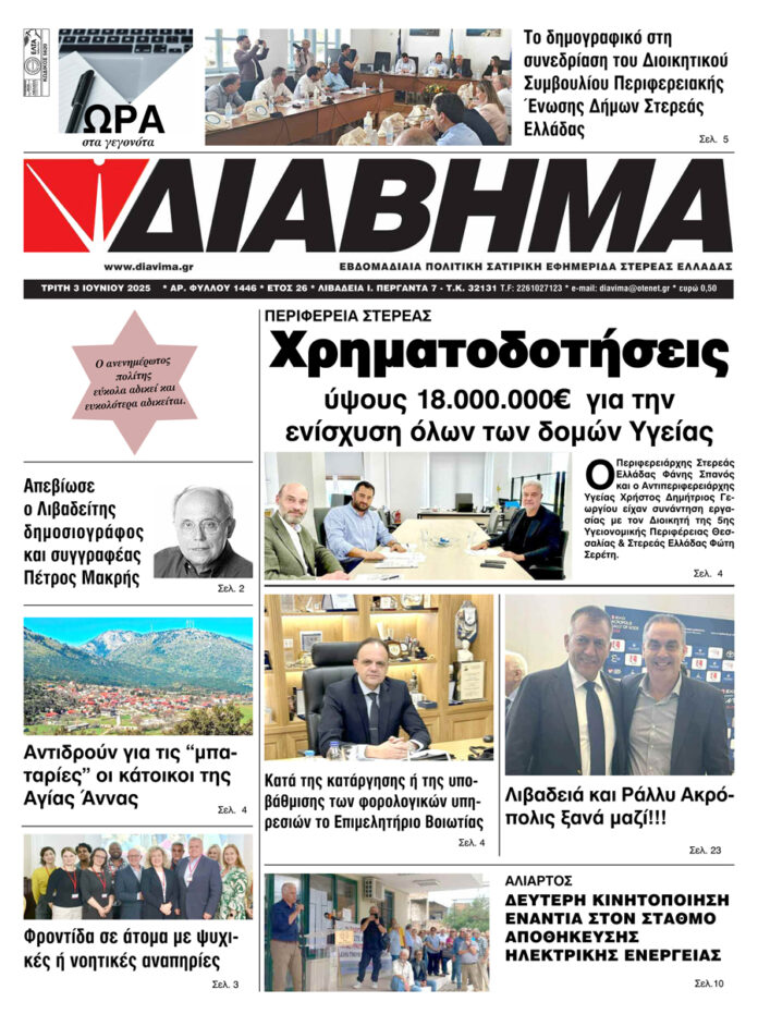 Ενημέρωση “ΔΙΑΒΗΜΑ”, Βοιωτία και Στερεά Ελλάδα. (1446 Τρίτη 03/06/2025)