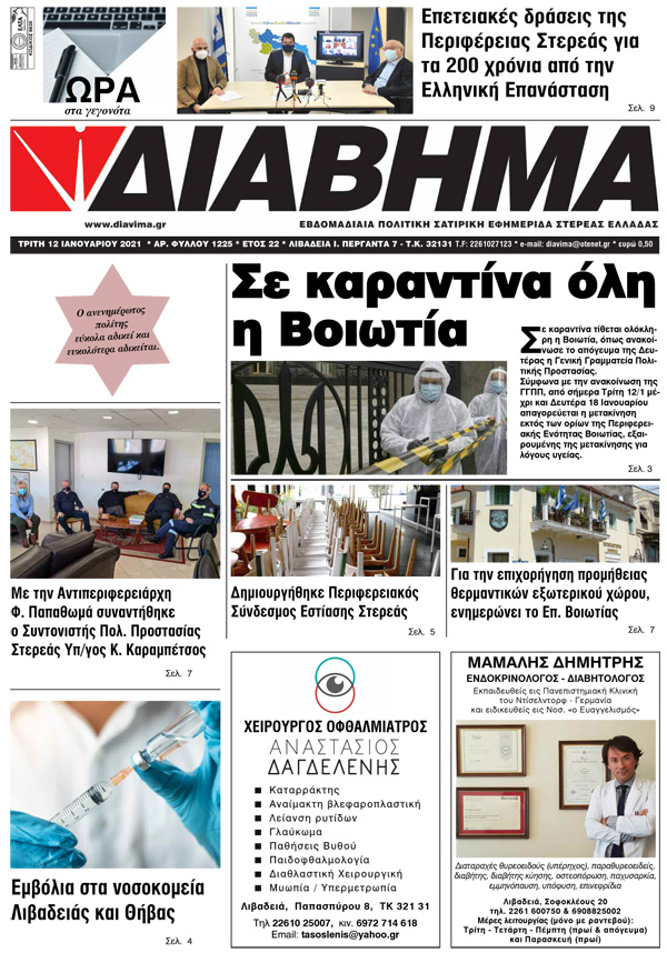 Διαβάστε το “ΔIABHMA” κάθε Τρίτη. Ενημέρωση από την Περιφέρεια Στερεάς Ελλάδας, Βοιωτία, Λιβαδειά, Θήβα. Προβληθείτε αποτελεσματικά μέσα από τις σελίδες του. Με ένα τηλεφώνημα στο 2261027123 κάντε το δικό σας “ΔΙΑΒΗΜΑ”. Στο περίπτερο, στο σπίτι σας ή στην επιχείρηση σας! Στο διαδίκτυο: diavima.gr και diavimapress.blogspot.