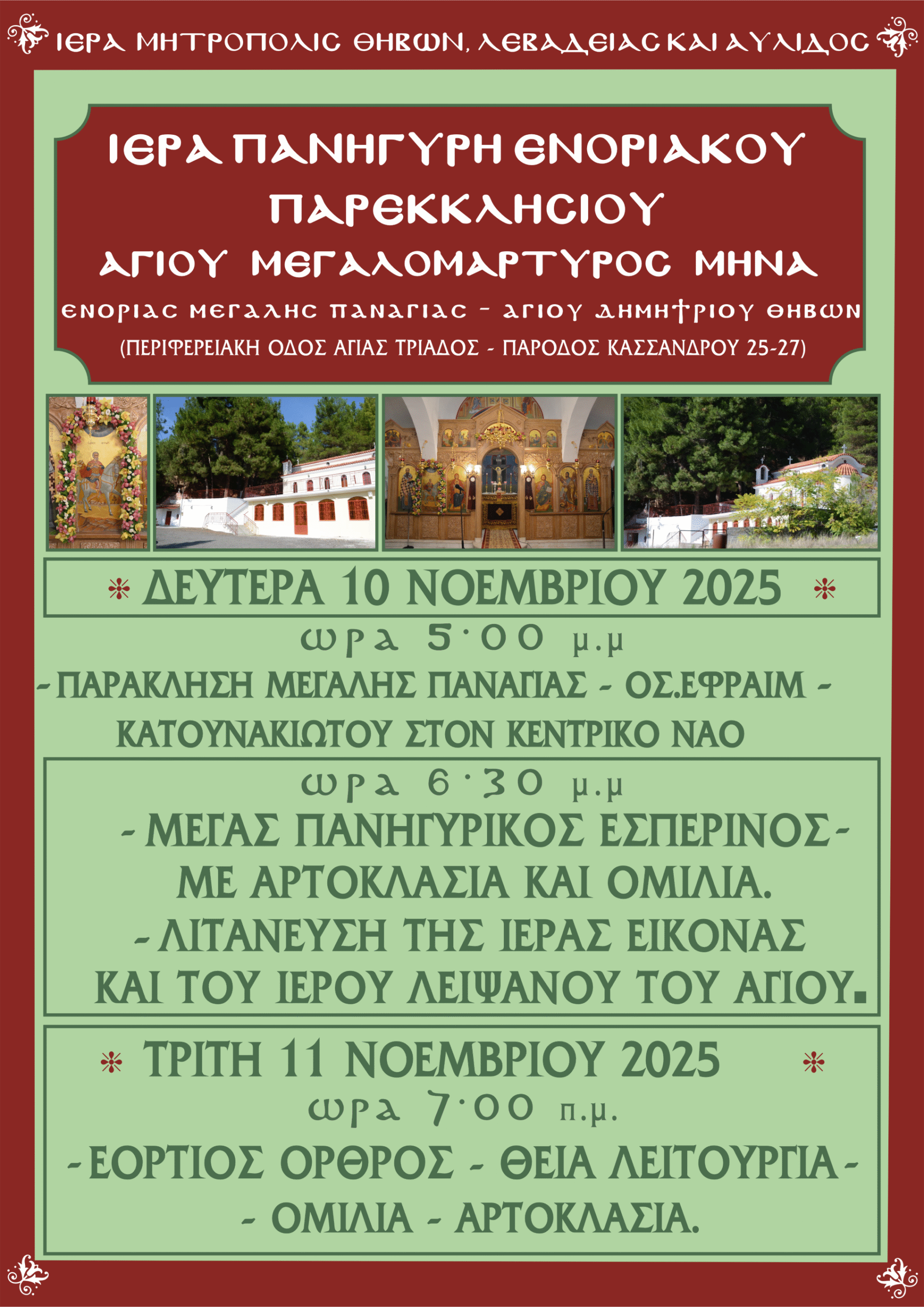 ΙΕΡΑ ΠΑΝΗΓΥΡΗ ΠΑΡΕΚΚΛΗΣΙΟΥ ΑΓΙΟΥ ΜΕΓΑΛΟΜΑΡΤΥΡΟΣ ΜΗΝΑ, ΕΝΟΡΙΑΣ ΜΕΓΑΛΗΣ ΠΑΝΑΓΙΑΣ – ΜΕΓΑΛΗΣ ΠΑΝΑΓΙΑΣ ΘΗΒΩΝ