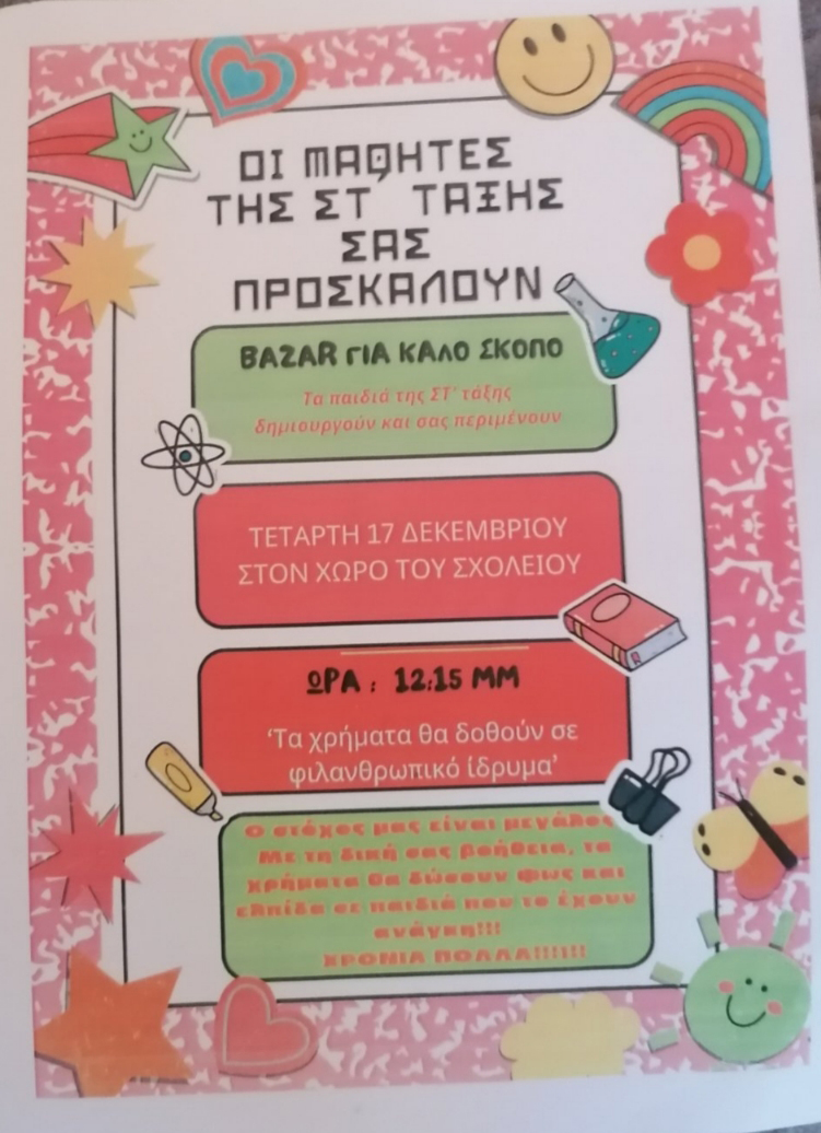 Την Τετάρτη (17/22), στις 12.15 το μεσημέρι στο Δημοτικό Σχολείο Παραλίας Διστόμου θα γίνει εκδήλωση με Bazaar Δώρων που έχουν επιμεληθεί οι μαθητές και οι μαθήτριες της ΣΤ’ Τάξης στο πλαίσιο των Εορτών!