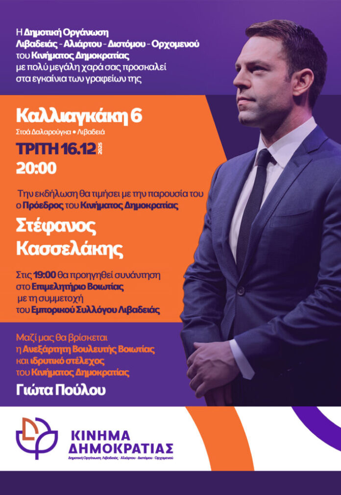 Ο Πρόεδρος του Κινήματος Δημοκρατίας, Στέφανος Κασσελάκης θα βρεθεί στη Λιβαδειά την Τρίτη 16 Δεκεμβρίου δίνοντας το παρών στα εγκαίνια των γραφείων της Δημοτικής Οργάνωσης Λιβαδειάς – Αλιάρτου – Διστόμου – Ορχομενού, στις 8:00 μ.μ., στην οδό Καλλιαγκάκη 6 (Στοά Δαλαρούγκα), έναντι του παλιού ΚΤΕΛ.