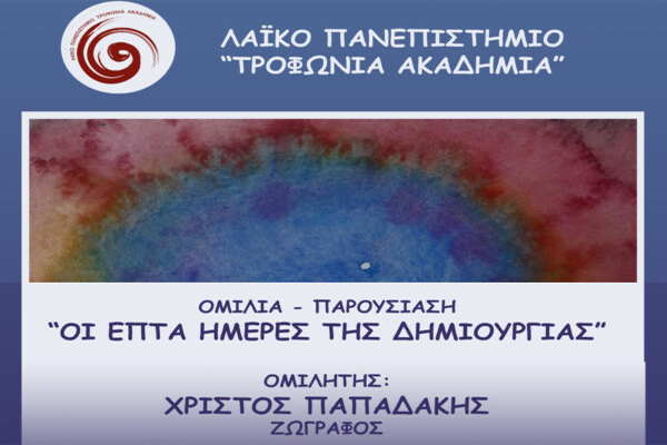 Η Τροφώνια Ακαδημία Λιβαδειάς ξεκινάει τις δράσεις της το Σάββατο 19 Οκτωβρίου με μια ομιλία -παρουσίαση του ζωγράφου Χρίστου Παπαδάκη, με θέμα: “Οι επτά ημέρες της Δημιουργίας”.