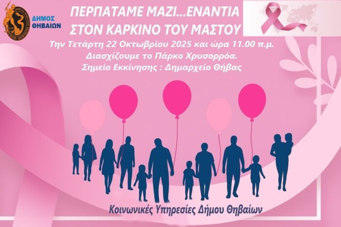 Άνδρες, γυναίκες και μαθητές κάθε ηλικίας με τη δυναμική συμμετοχή φορέων και συλλόγων διασχίζουμε το βιοκλιματικό πάρκο της πόλης για…καλό σκοπό, μεταδίδοντας το μήνυμα της αλληλεγγύης, της πρόληψης και της ορθής ενημέρωσης ενάντια στον καρκίνο του μαστού στο πλαίσιο των ενεργειών ευαισθητοποίησης και ενημέρωσης που διεξάγει ο Δήμος Θηβαίων.