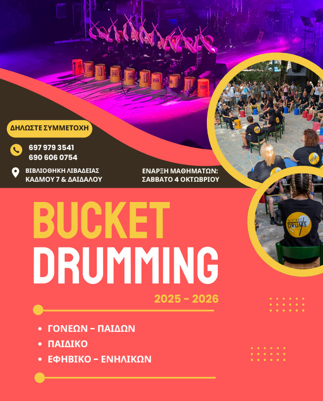 Η Δημόσια κεντρική Βιβλιοθήκη Λιβαδειάς και ο σύλλογος “Φίλοι της Βιβλιοθήκης Λιβαδειάς” σε συνεργασία με το Μουσικό Στούντιο Fortepiano διοργανώνουν μια ακόμη σειρά των επιτυχημένων μαθημάτων με τον τίτλο «BUCKET DRUMMING στη Βιβλιοθήκη!».