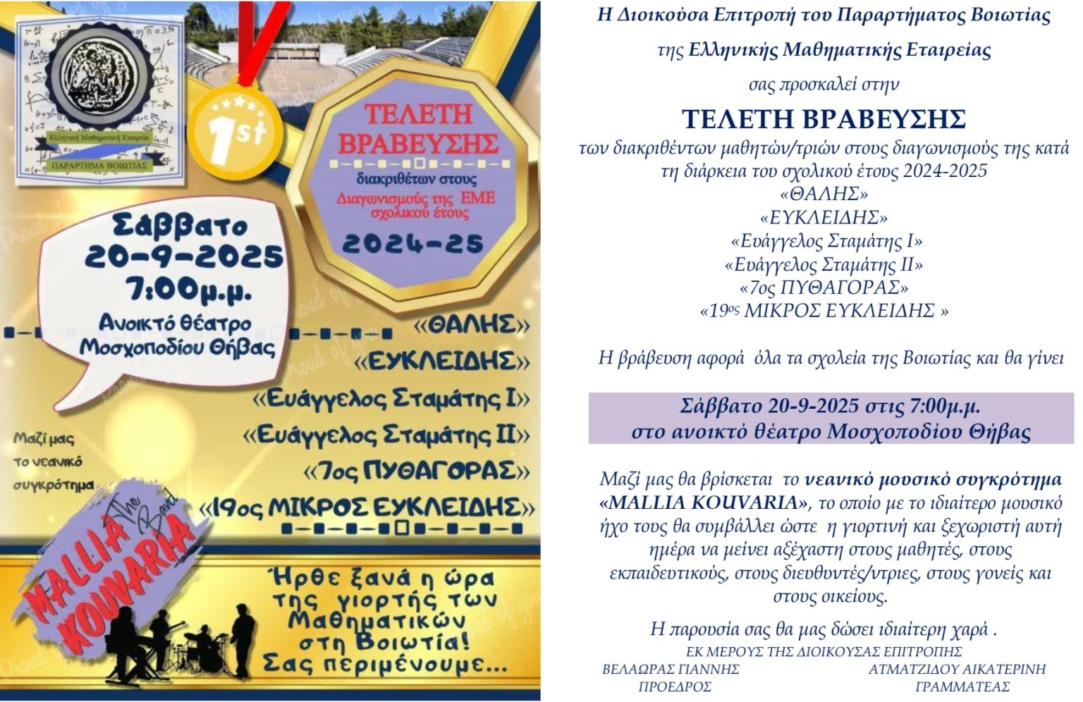 Η βράβευση αφορά όλα τα σχολεία της Βοιωτίας και θα γίνει στο ανοικτό  θέατρο Μοσχοποδίου Θήβας