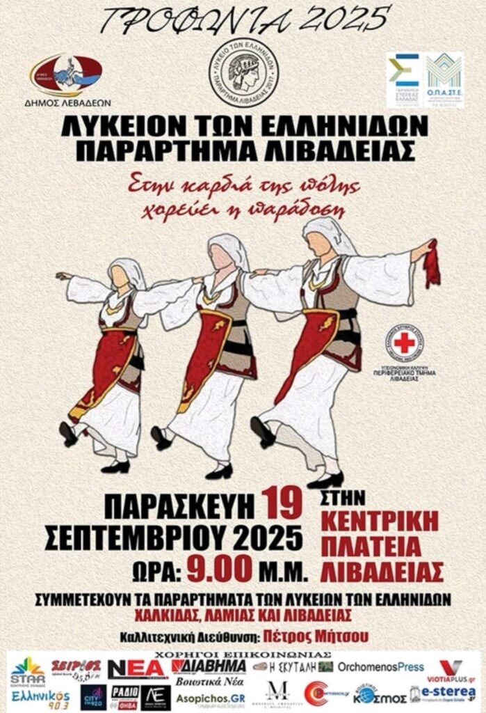 “Στην καρδιά της πόλης χορεύει η παράδοση” είναι ο τίτλος εκδήλωσης που διοργανώνει το Λύκειο Ελληνίδων Λιβαδειάς το βράδυ της Παρασκευής 19 Σεπτεμβρίου, στο πλαίσιο των “Τροφωνίων 2025”.