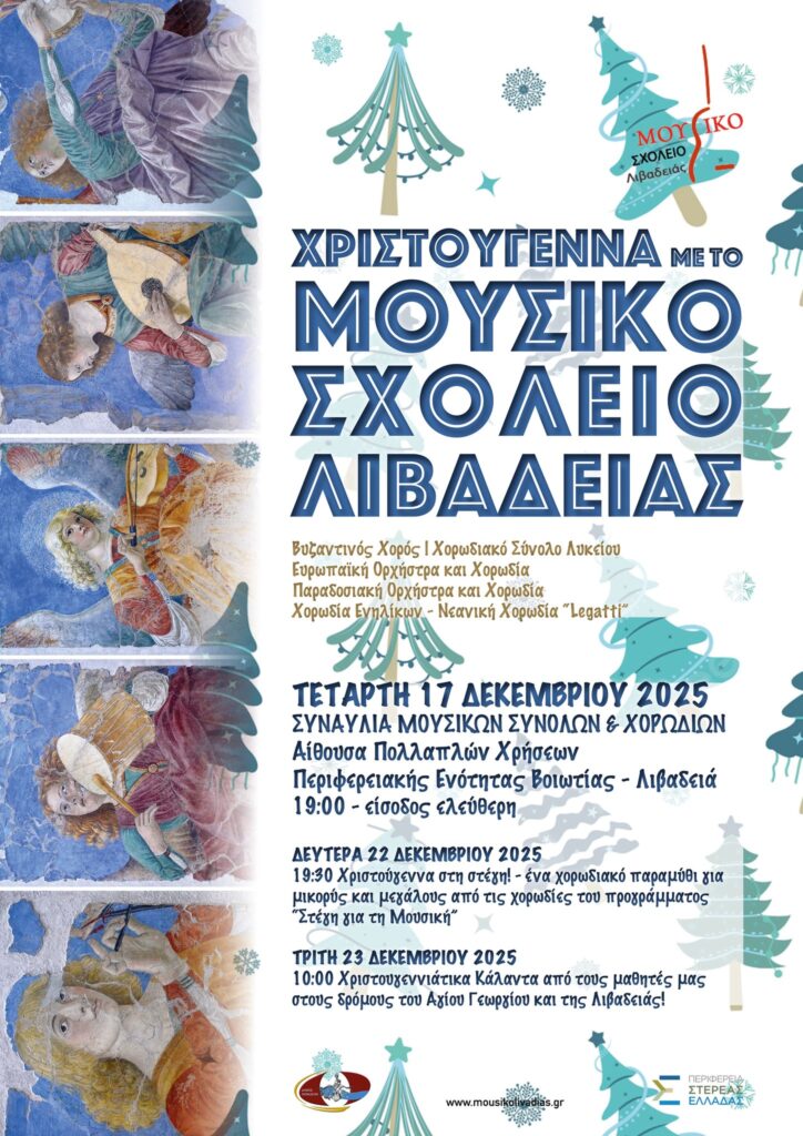 Το Μουσικό Σχολείο Λιβαδειάς καλεί και φέτος στη μεγάλη Χριστουγεννιάτικη Συναυλία που διοργανώνει με την υποστήριξη της Περιφέρειας Στερεάς Ελλάδας και του Δήμου Λεβαδέων στην Αίθουσα Πολλαπλών Χρήσεων της Περιφερειακής Ενότητας Βοιωτίας στη Λιβαδειά, την Τετάρτη 17 Δεκεμβρίου, στις 7 το απόγευμα.