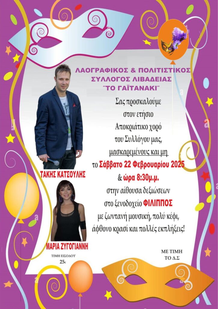 Ο Λαογραφικός & Πολιτιστικός Σύλλογος Λιβαδειάς το “Γαϊτανάκι” προσκαλεί στον καθιερωμένο αποκριάτικο χορό του, το Σάββατο 22 Φεβρουαρίου, στην αίθουσα δεξιώσεων του ξενοδοχείου “Φίλιππος”.