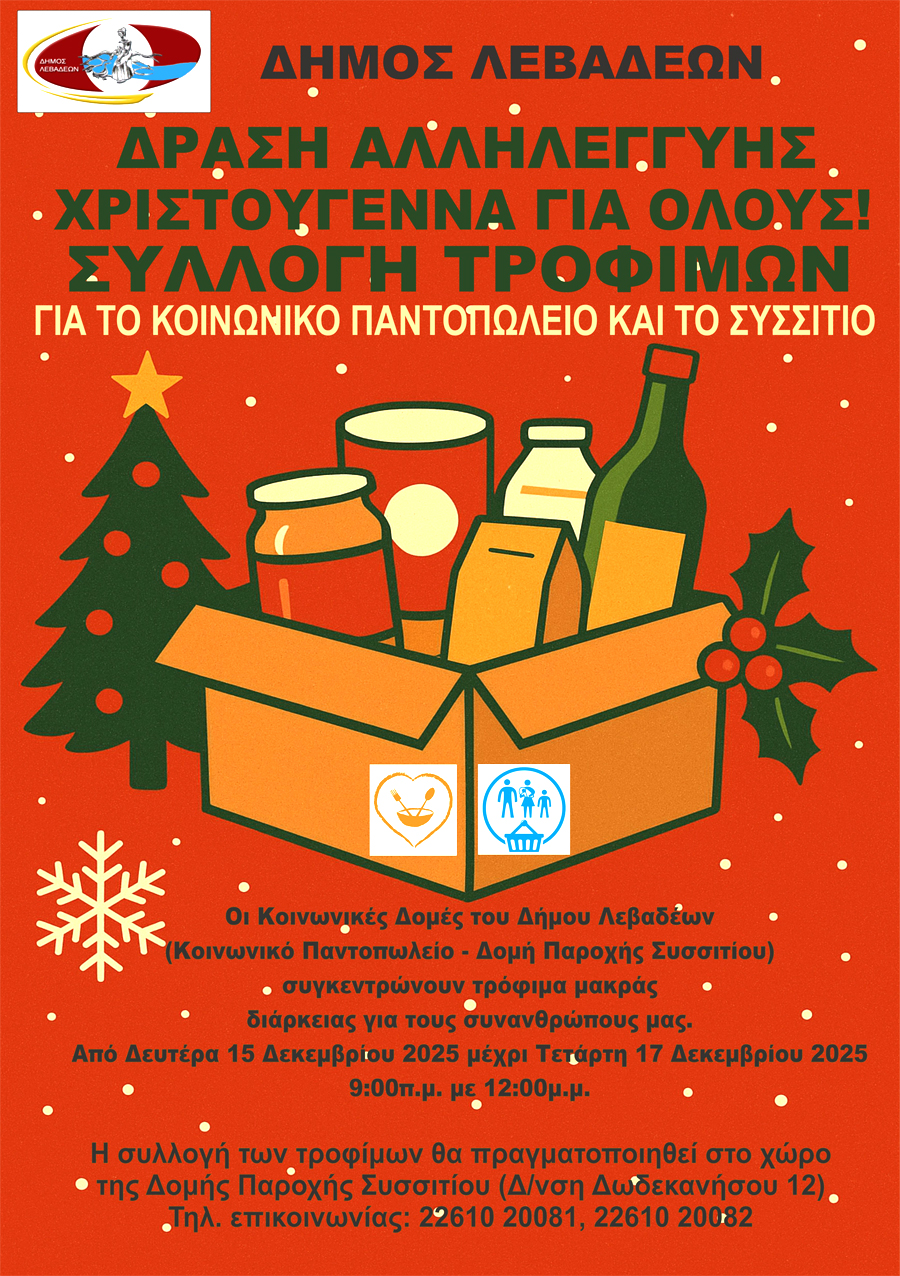 Στα πλαίσια των Χριστουγεννιάτικων εκδηλώσεων των Κοινωνικών Δομών του Δήμου Λεβαδέων (Κοινωνικό Παντοπωλείο – Δομή Παροχής Συσσιτίου) θα πραγματοποιηθεί τριήμερη δράση αλληλεγγύης με συλλογή τροφίμων μακράς διάρκειας.